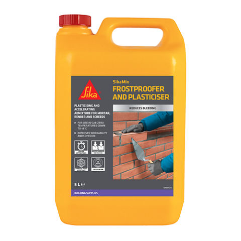 SikaMix Frostproofer and Plasticiser is an air entraining chloride free liquid admixture for mortar which also acts as an accelerator for work in sub-zero temperatures. Improves workability and freeze/thaw resistance in brick laying mortars and eliminates the need for a separate frostproofer.