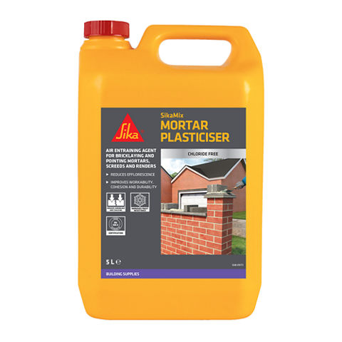 SikaMix Mortar Plasticiser is a ready to use plasticising and air entraining liquid admixture for mortars and plaster. Increases workability, durability and cohesion of bricklaying mortars, renders and screeds. Its chloride free formula helps prevent corrosion of steel, cracking, shrinkage and efflorescence without affecting setting time.