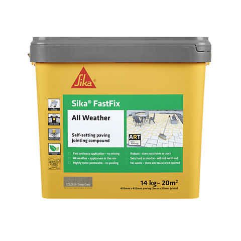 Sika FastFix® All Weather is a ready to use, self-setting paving jointing compound with Active Resin Technology for advanced durability. It sets hard and will not wash out, while still remaining water permeable. Sika FastFix® All Weather is perfect for outdoor patios, pavements and paths with joints over 5 mm wide and 20 mm deep. Fast and easy to use, it can be applied in any weather conditions even in the rain. Sika FastFix® All Weather can also be stored and reused after opening to reduce waste.